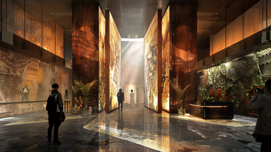 不同展區(qū)之間通過精心設計的過渡場景相連接,比如從“探索之路”到“智慧結(jié)晶”的轉(zhuǎn)變過程中,采用了漸變色彩搭配以及柔和的燈光過渡,讓參觀者的注意力能夠自然地從一個主題轉(zhuǎn)移到另一個主題。這樣的設計不僅保證了整體空間的連貫性,同時也增強了觀展體驗的流暢度。